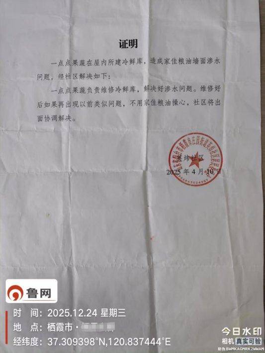 2025年4月,庄园街道办有劲政工的衣书记通过社区主任向刘密斯供给一份《说明》,确认粮油店墙面渗水系邻人“一点点果蔬店正在屋内所筑冷鲜库”变成,并许可“维修睦后若再涌现近似题目,社区将签名协和处理”。然而渗水根基仍未查明,墙面阴水、墙体开裂、地砖挤压破裂的情景连接恶化。
